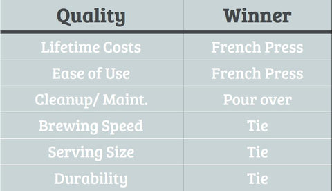 French Presses and pour overs use time to extract the flavor from the coffee beans. It takes the same 4 minutes to brew a cup of coffee with either the French Press or a pour over. There isn't a clear winner on how quickly you will get your cup of coffee with either of these brewers.